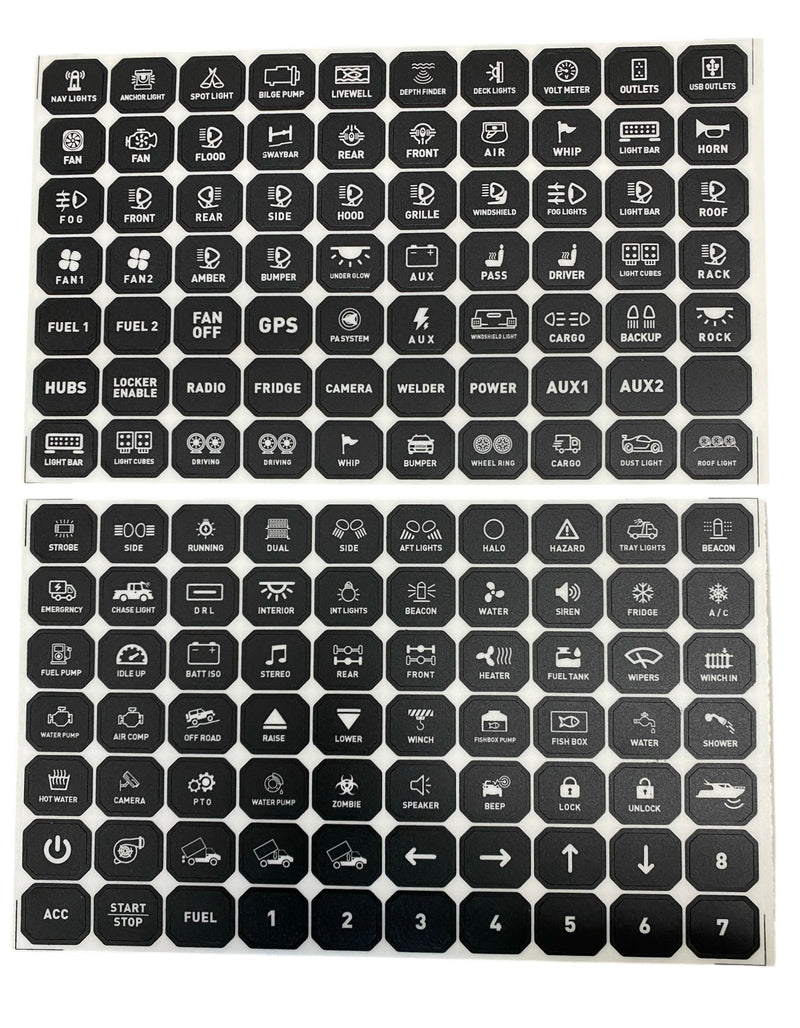 Replacement sticker sheets for GG Lighting 8 or 12 gang switch panel. Both are included per order.